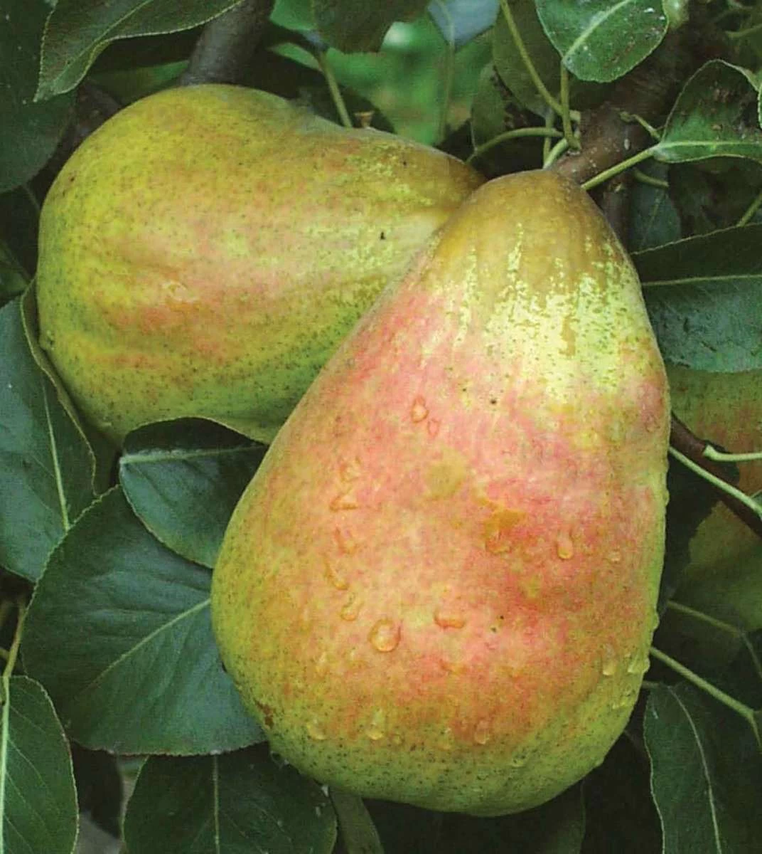 Fruit ripens in late August to early September, and can be stored if picked just as their stems snap when the fruits are pulled to a horizontal position. The large pears turn yellow with a pink blush as they ripen. Needs 500-600 chill hours to reliably set fruit.
